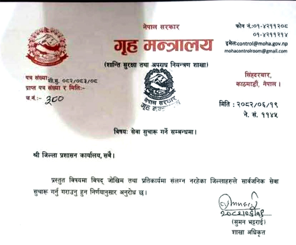 आज देशभरका जिल्ला प्रशासन कार्यालयहरूलाई परिपत्र गरी मन्त्रालयले विपद्जन्य अवस्था नभएका ठाउँमा सरकारी कार्यालयबाट प्रवाह हुने नियमित सेवा प्रवाहको काम नरोक्न निर्देशन दिएको छ ।