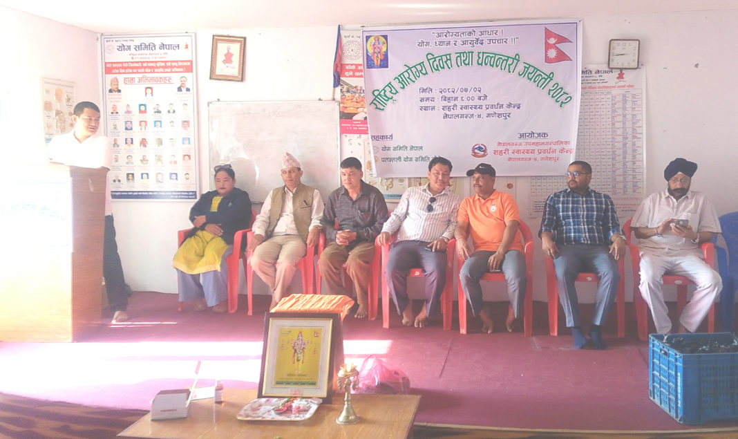वन–जंगलमा पाइने जडीबुटीमा आधारित प्राचीन वैदिक चिकित्सापद्धति आयुर्वेदका प्रवर्तक भगवान धन्वन्तरीको जन्मजयन्तीको स्मरणमा देशभर विविध कार्यक्रमको आयोजना गरि दिवस मनाउने क्रममा नेपालगन्ज उपमहानगरपालिका शहरी स्वास्थ्य प्रवर्धन केन्द्रले योग समिति नेपाल र पतन्जली योग समिति बाँकेसँगको सहकार्यमा सचेतनामुलक कार्यक्रम गरेको थियो ।